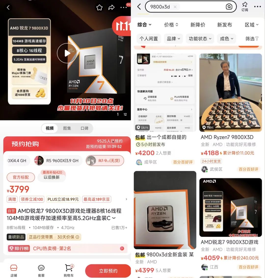 首發原價 3799 元的 R7-9800X3D 已經被炒到了 4200 元左右。