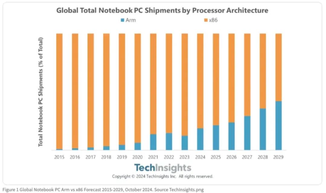 有,不僅有,而且還很廣闊,據調查機構顯示,目前 Arm 架構的 PC 佔比已經來到了 20% 左右,到 2029 年,預計佔比 40% 左右。