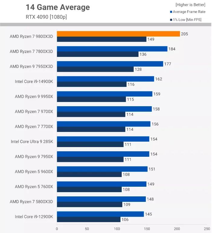 新一代的 R7-9800X3D 落實到具體遊戲測試表現上面與前代相比平均提高了 11%,並且一騎絕塵地與後面的友商拉開了差距。
