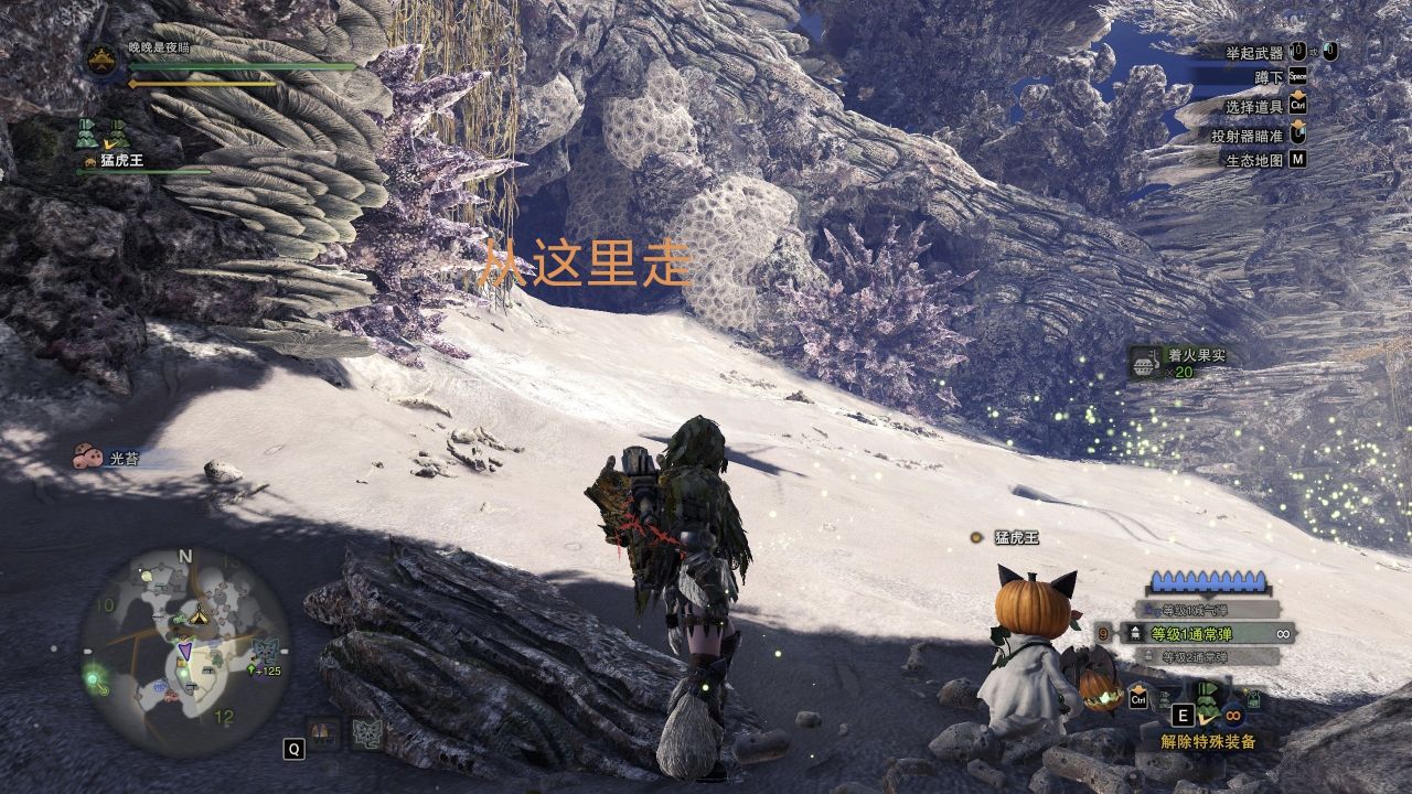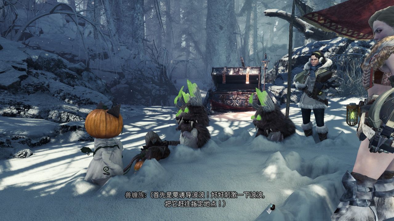 ⑥回到營地找接待員接取任務,然後去狩獵冰魚龍,趕路途中可以拿石頭打波波,它會帶你去找冰魚龍