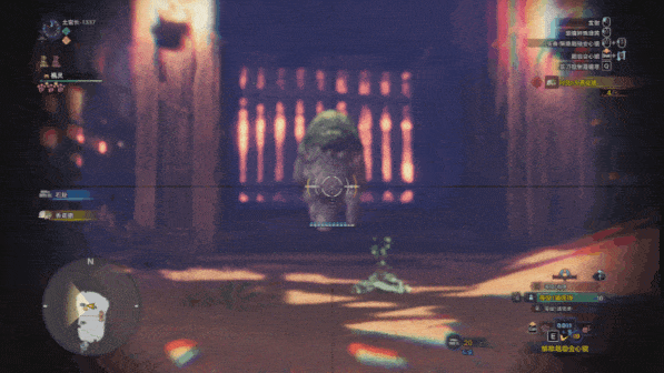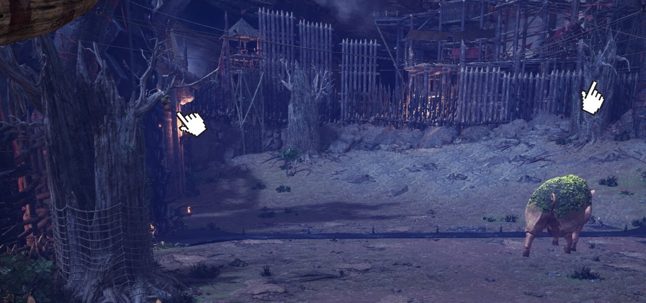 這兩棵樹上掛着飛散核桃,可以用抓鉤抓下來撿,地上也會有石頭,兩種投射物效果不同。↓