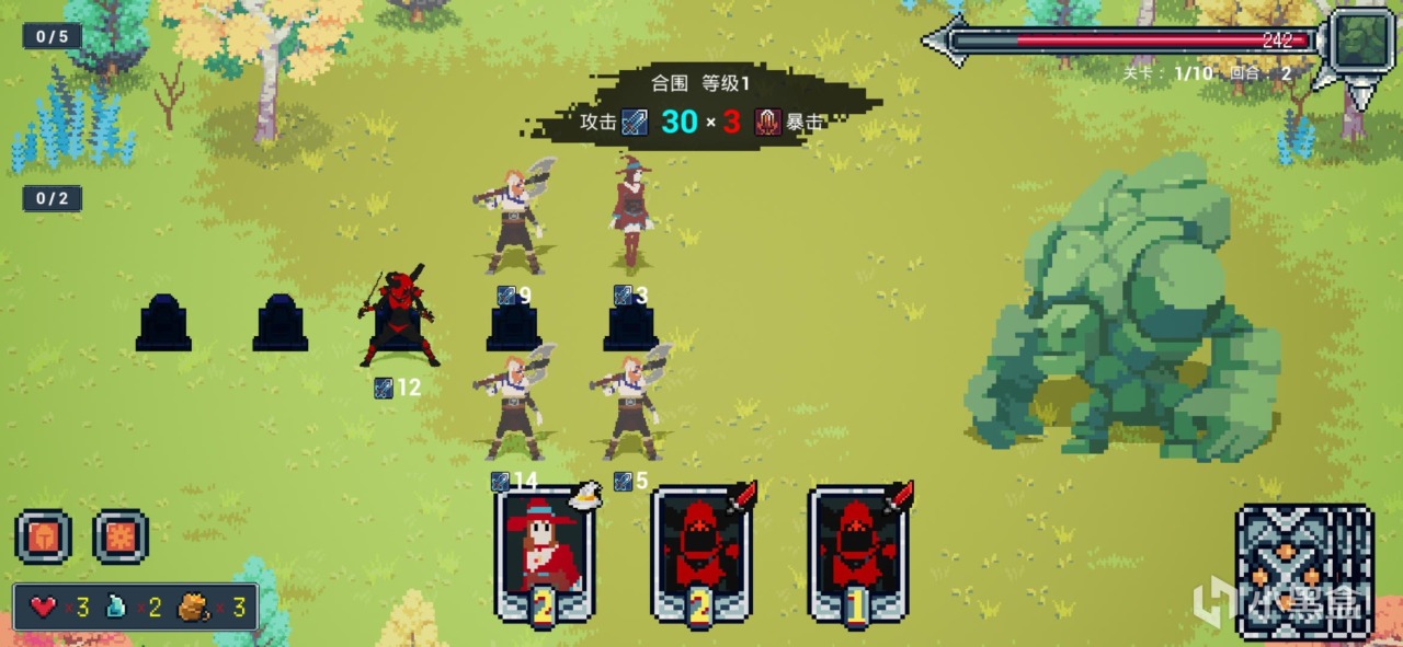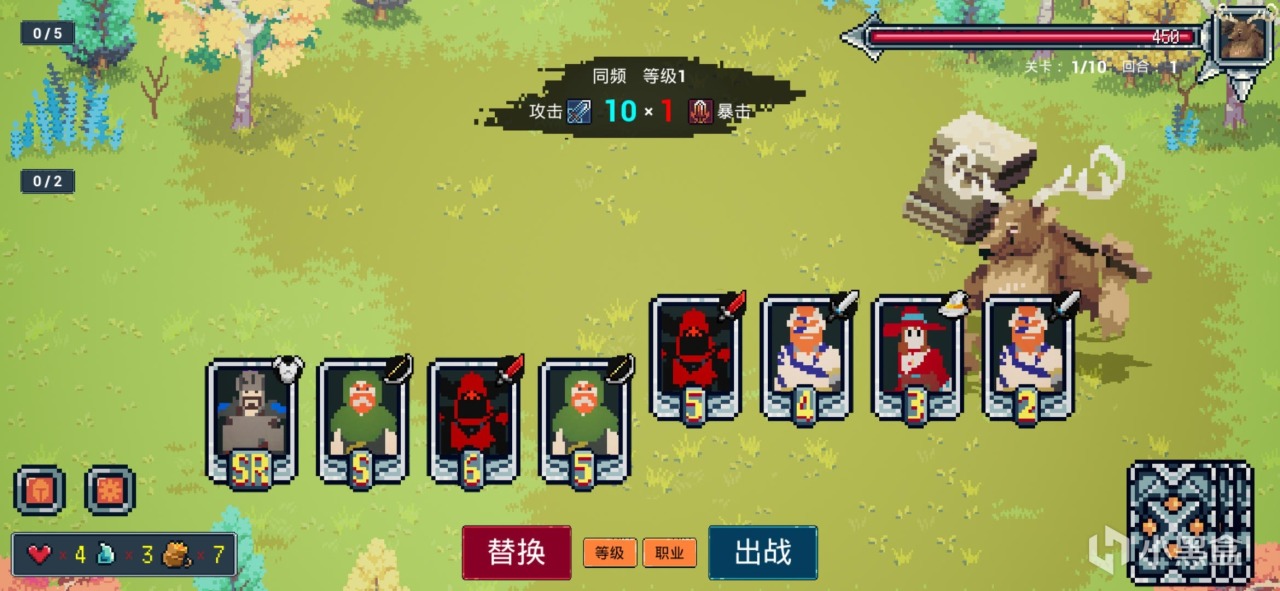 遊戲開始沒有簡單的彎彎繞繞,直接就是挑戰對面的怪物。遊戲戰鬥十分簡單,通過我們每次上場角色的傷害來和對面進行戰鬥。通俗的講就是比傷害的大小,所以我們選擇的每一次卡片都有影響我們的成敗。遊戲界面的左下角我們的HP值,HP清零遊戲結束。遊戲每次開始會提供給我們八張卡牌,我們最多可以選擇五張。每次開始都會進行補足,隨着遊戲的進行可能會發生改變,如果覺得當前牌局不滿意我們還可以挑選幾張進行洗牌。當然洗牌也是有一定次數限制的。