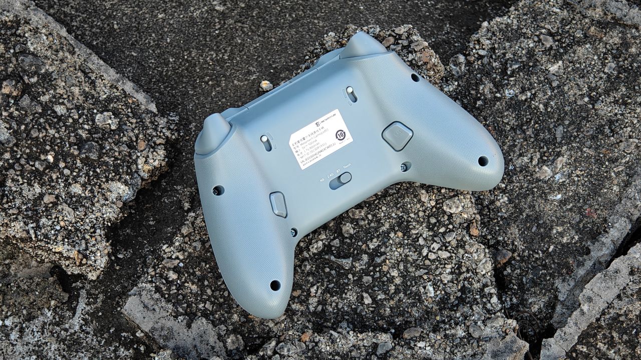 來到背面能看到,兩顆可自定義背鍵與模式切換撥片,手柄支持 PC Switch 安卓 蘋果多平臺使用,同時在安卓上還支持按鍵映射遊玩非原生遊戲,比如:王者榮耀