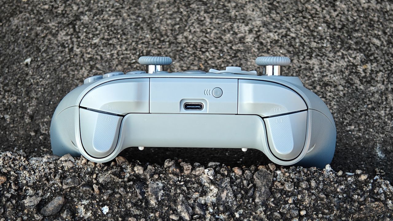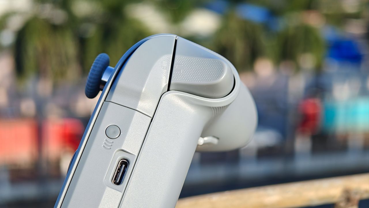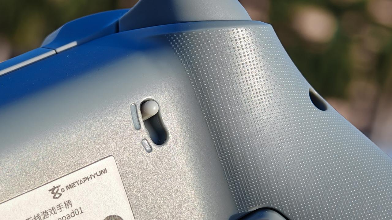 手柄頂部爲肩鍵,扳機與配對按鍵,肩鍵採用了機械輕觸開關設計,按壓不費力聲音清脆,扳機爲霍爾線性扳機,在扳機跟肩鍵的位置都設置了防滑紋路,增加按壓手感,又能防護。
