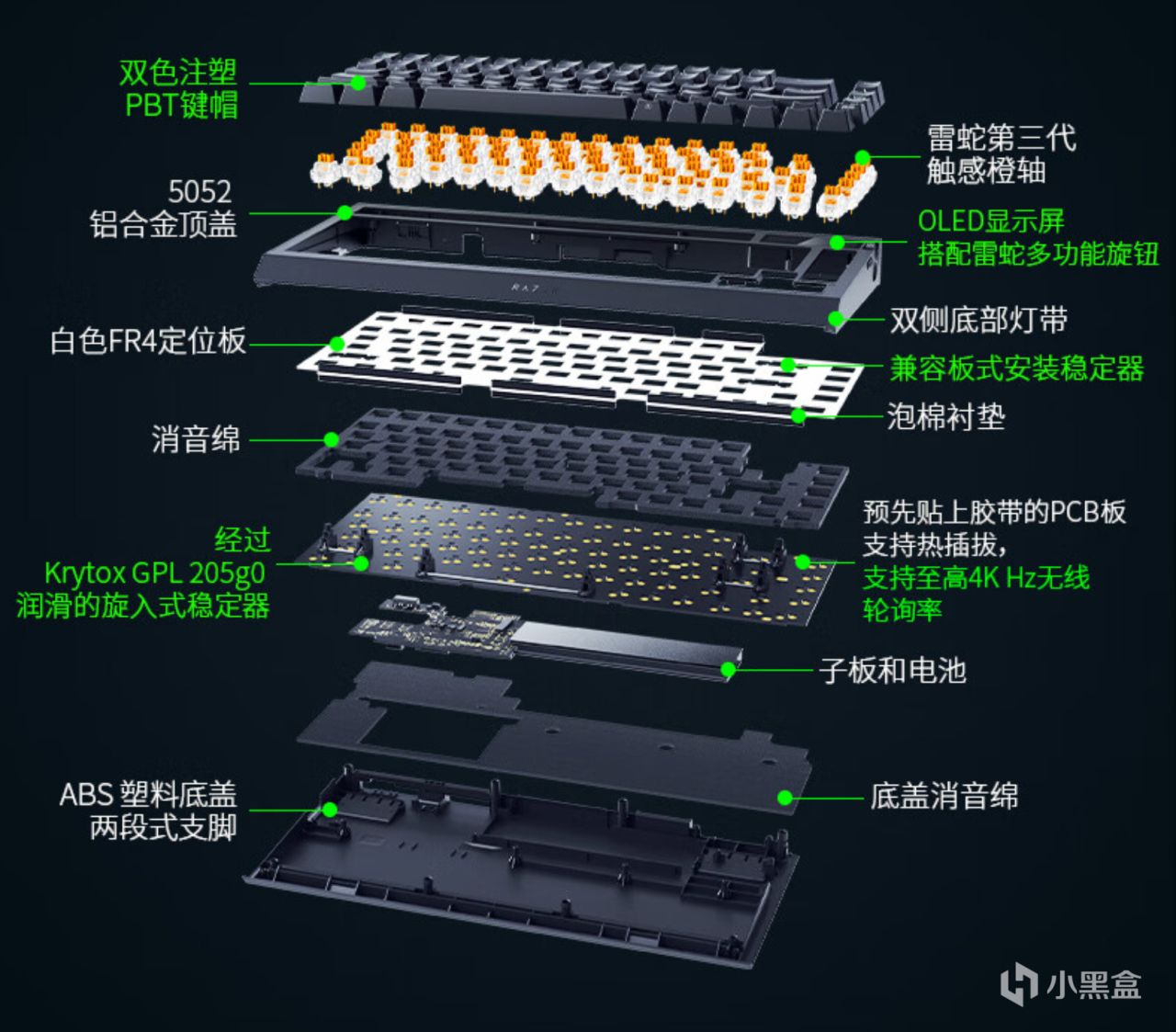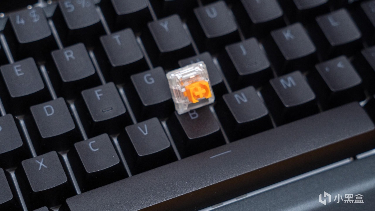 雷蛇第的三代機械橙軸設計,3.5mm的鍵程,2.0mm的觸發設計。觸發壓力50gf,屬於相對靜音的線性軸體設計。採用透明外殼,並配備了透鏡,所以光效槓槓的,燈廠不會讓大家失望。