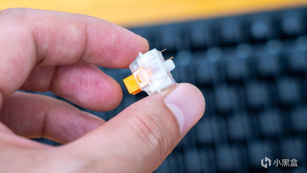 此外作爲一把客製化鍵盤,支持熱插拔軸體設計,可以兼容3腳/5腳的機械軸,標配的橙軸爲3腳觸點設計,另外也有官方軸體可選。