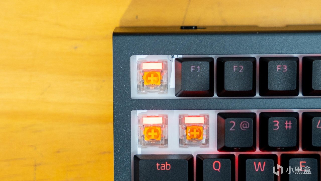 遊戲體驗方面,橙軸具有2mm的觸發設計,加上雷蛇的HYPERSPEED高速無線模式可以幫助玩家在遊戲中佔得先機。橙軸的手感方面個人感覺敲擊的舒適度還是非常不錯的,而且作爲客製化鍵盤後期的可玩性還是非常不錯的。自己去嘗試選擇合適的軸體也是機械鍵盤帶給我們的樂趣之一了。