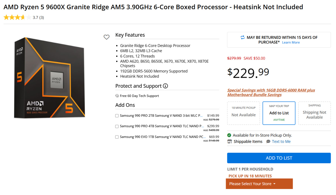 最后是,锐龙5 9600X现在售价为229.99美元,最初售价为279.99美元,降了50美元。借助这些零售商的打折,AMD似乎正试图改变消费者对其非X3D芯片的看法,提高认知度。