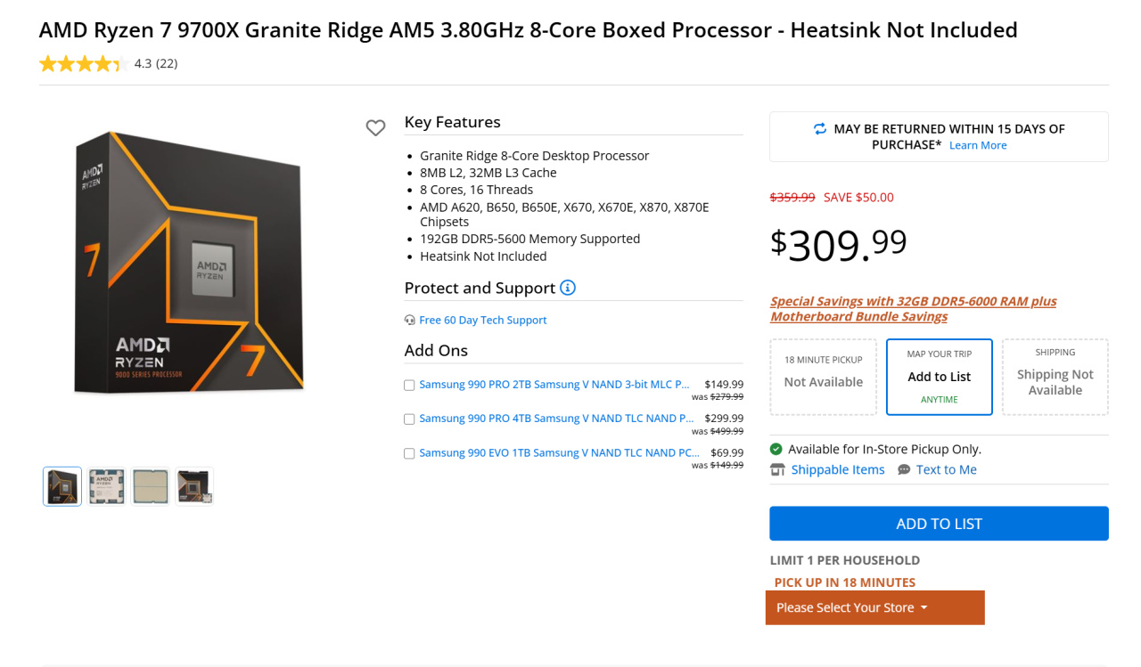 美国知名电商Microcenter最近下调了所有四款锐龙9000处理器的价格。其中,售价最高的是锐龙9 9950X 16核处理器,现售价569.99美元,比原价650美元便宜了80美元。