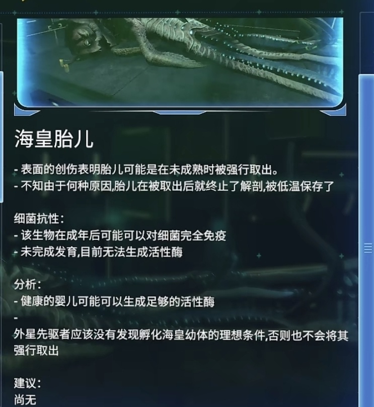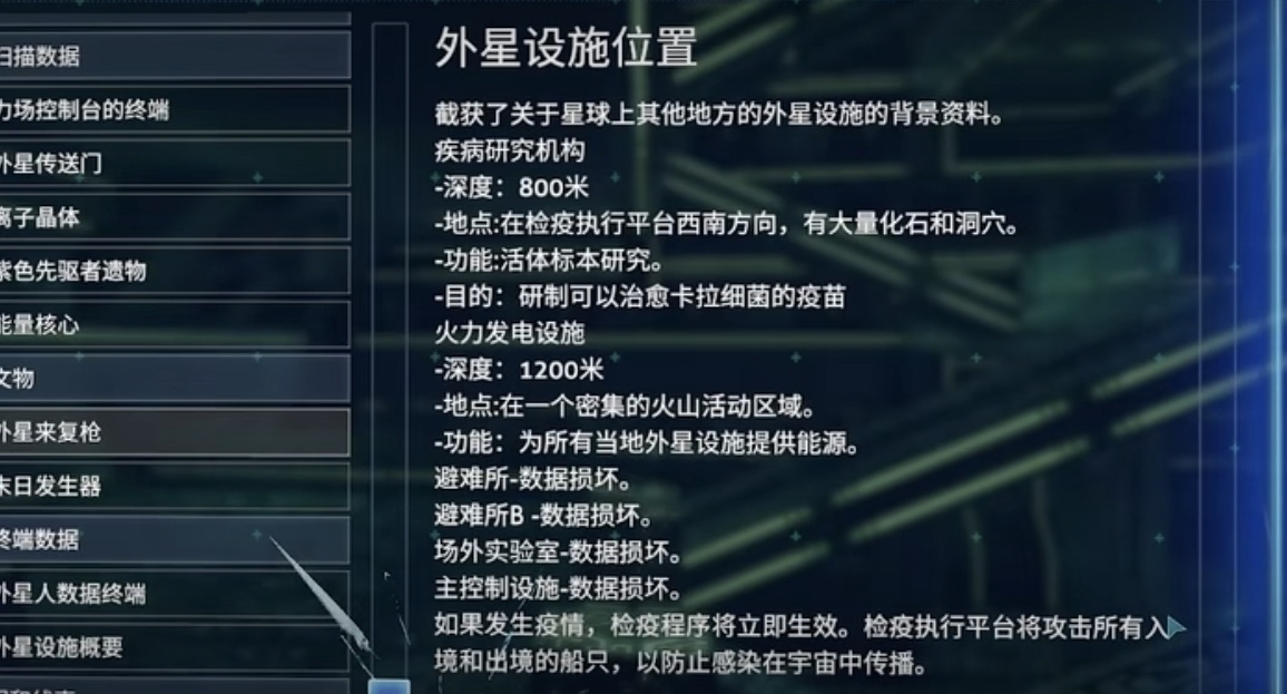 前往800米設施後,結合獲取的情報以及自我掃描,主角發現:自身已經感染了一切的罪魁禍首:卡拉細菌。而這個叫作先驅者的外星文明爲了研究解藥來到了4546B這個星球,先驅者發現當地的本土生物“海皇”似乎可以產生一種緩解疾病的42號活性酶,但卻因爲不知名原因導致病毒擴散。爲了遏制疾病擴散,先驅者修建了巨大的檢疫平臺大炮,還有遊蕩在海中各處的機械生物用來“物理”消滅細菌。