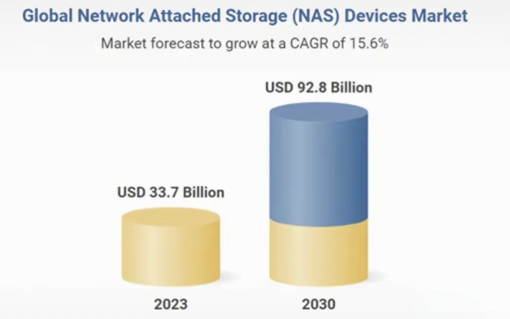 據 Research And Markets 估計,2023 年全球 NAS 設備市場銷售額達到 337 億美元,預計 2030 年會達到 928 億美元,年複合增長率爲 15.6%。