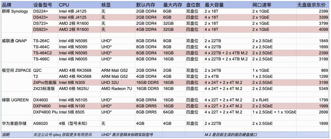 爲方便小夥伴們選購,小 q 整理了下目前主流消費級 NAS 的參數和價格: