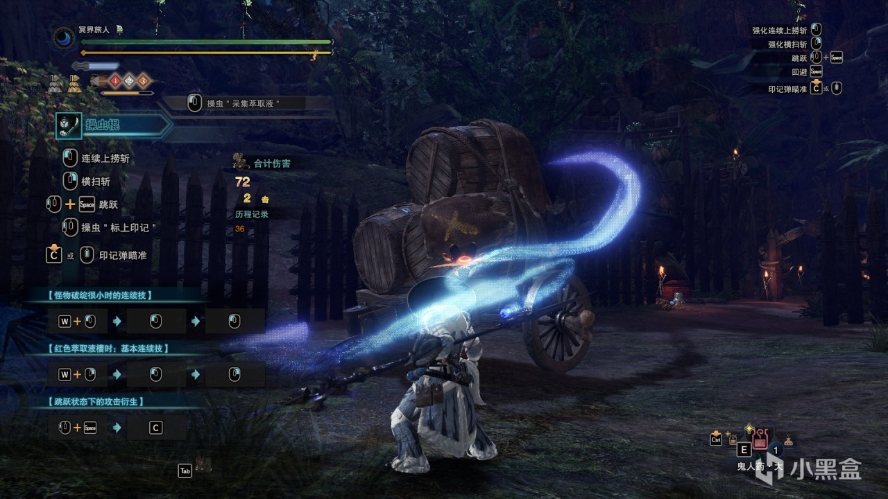 空中按鼠標右鍵:強化跳躍突進斬[如果最後一擊打到了單位,可以積累騎乘值並進行舞踏跳躍從而復讀強化跳躍突進斬,最多打五次跳躍強化突進斬。這也就是一般人吐槽的飛天蟲棍 因爲這個狀態下不增加怪物的騎乘值,並且傷害較低,僅推薦特殊情況使用]