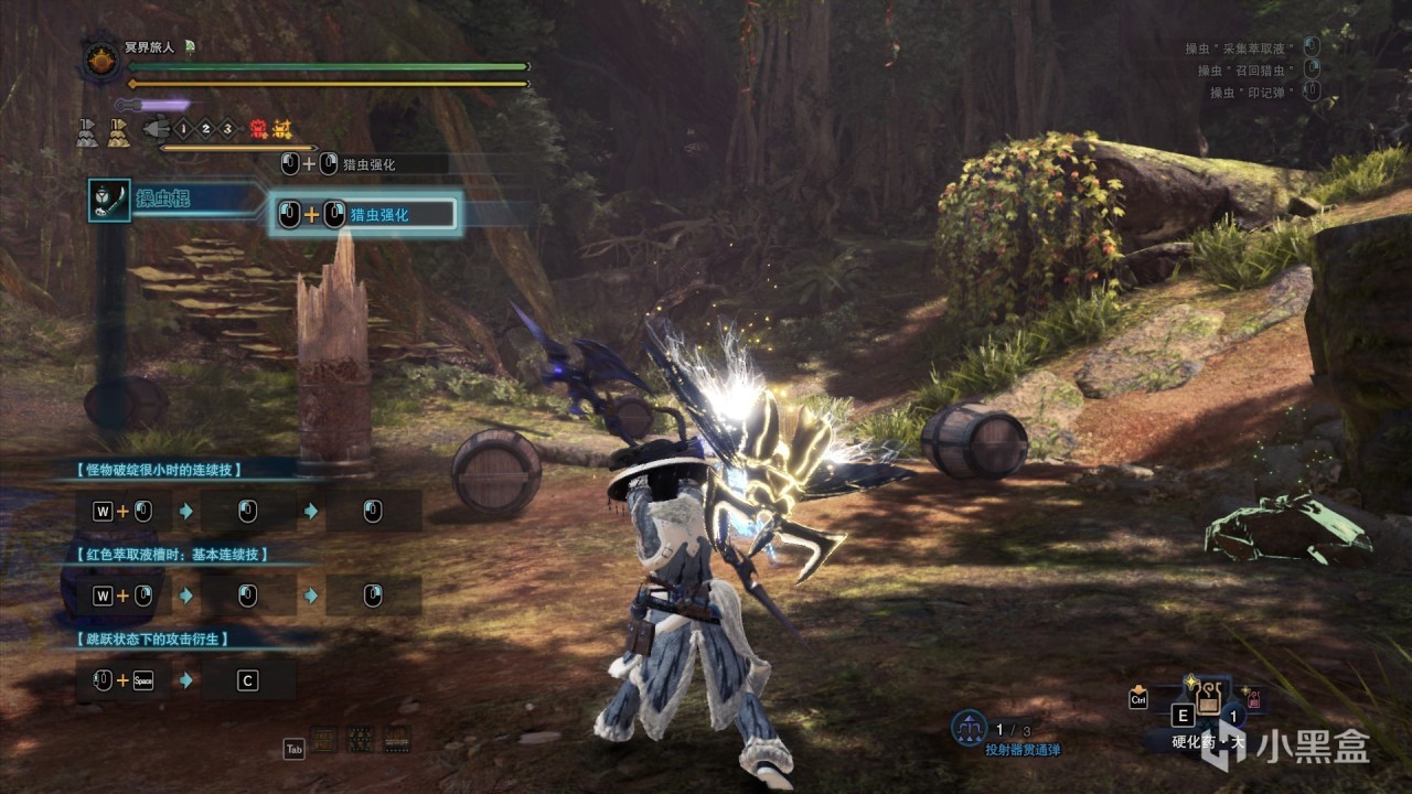 介紹完了如何在道具箱裏選擇蟲棍,我們來看一下蟲棍的獨特機制,當我們進入訓練場,我們可以在屏幕左上方,武器斬味遊右下角看到一個蟲子和1 2 3三個方格,底下還有一個黃條