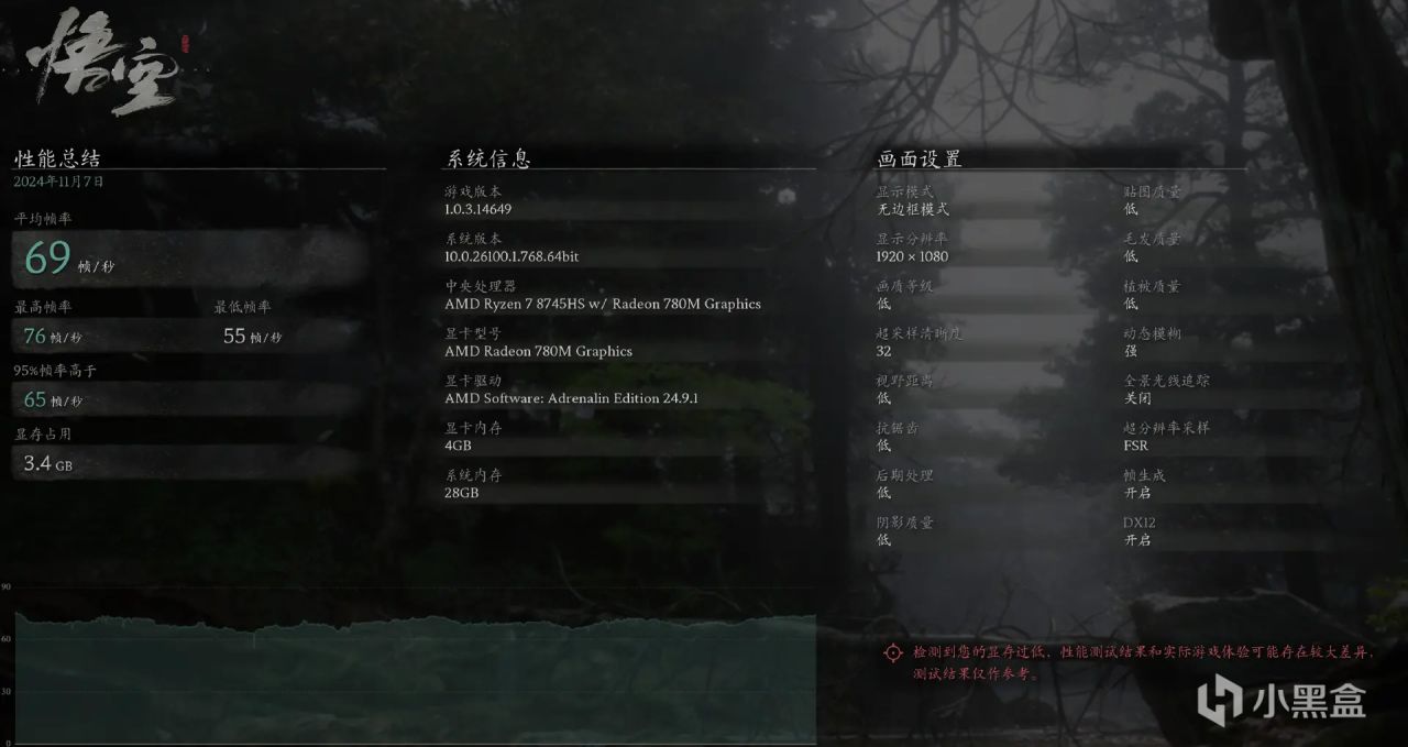 ▲经实测,在1080P分辨率,预设低画质,FSR帧生成开启时,零刻 SER8可以提供69 FPS的平均帧率,最低帧率也有55 FPS,可以说足够流畅,大家可以开心的送猴头了。