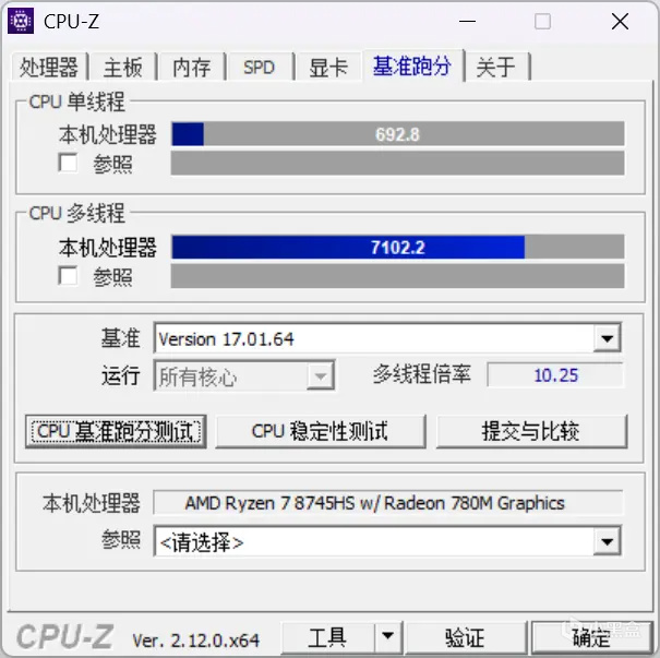 ▲我们还是首先了解一下这款机型的理论性能。在CPU-Z的测试中,AMD 锐龙7 8745HS单核跑分692.8分,多核跑分7102.2分,与intel 酷睿 Ultra 5相差不大。