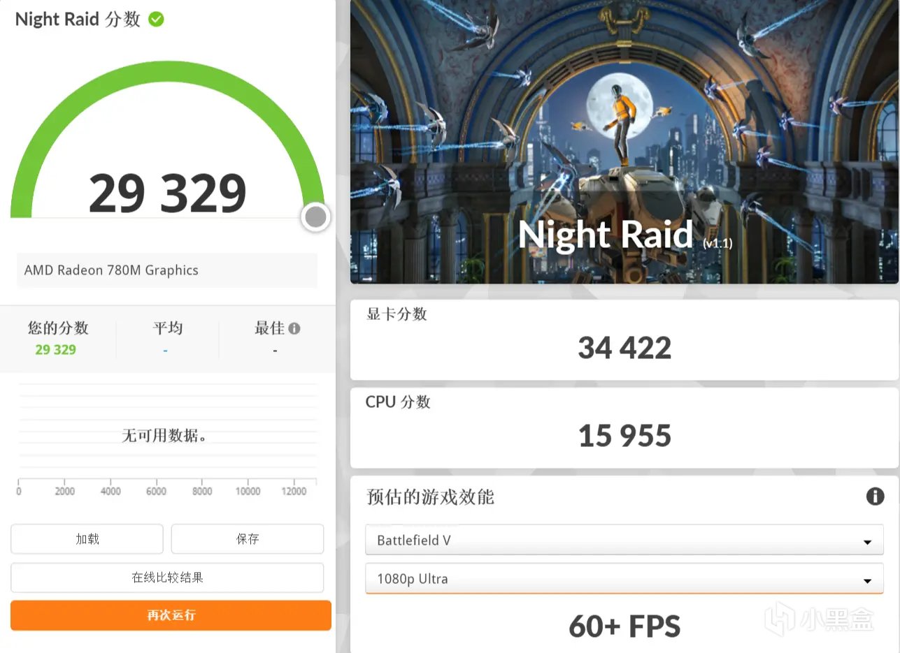 ▲上面的是Fire Strike本来是测试带独立显卡电脑的,所以我们再来用专门测试核显电脑的3DMark Night Raid来试试,经实测,零刻 SER8可以获得总分29329分,其中显卡得分34422,CPU分数15955,预估的《战地 5》的平均帧率也在60 FPS以上。