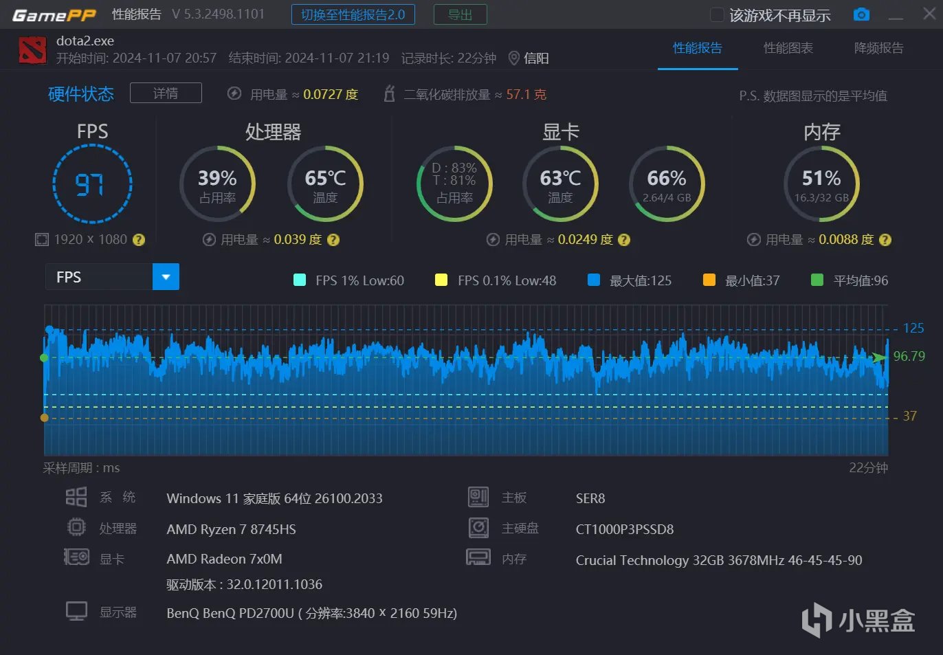 ▲经实测,零刻 SER 8可以提供97 FPS的平均帧率,大家还是可以战个痛快的。