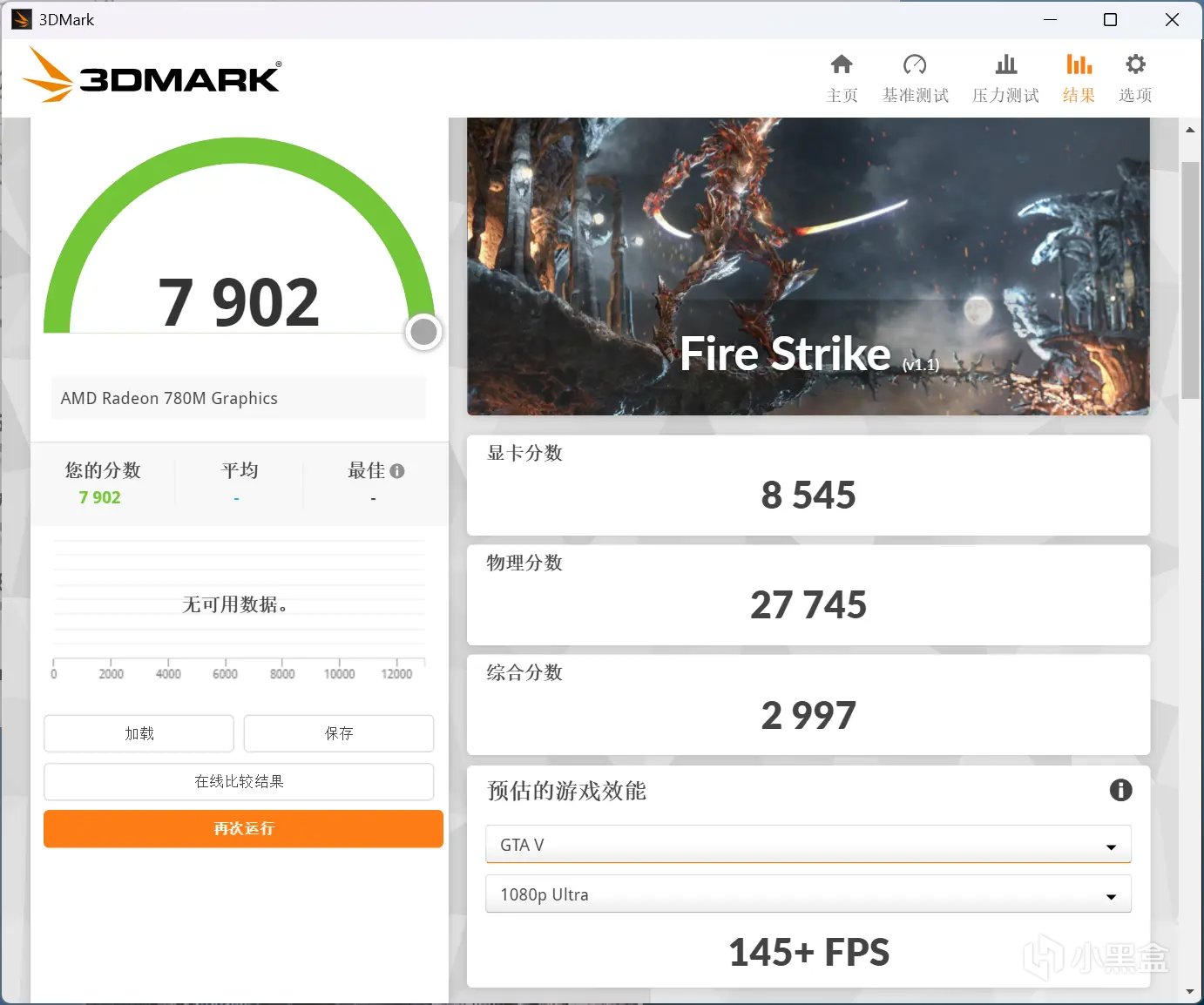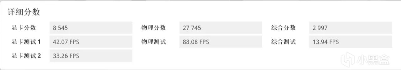 ▲然后我们再来测试一下AMD 锐龙7 8745HS的游戏性能,在测试DX11游戏的3DMark Fire Strike中,零刻 SER8总得分7902,其中显卡分数8545,物理分数27745,综合分数2997分,显卡测试均可以在30~45 FPS下运行,属于能玩区间。
