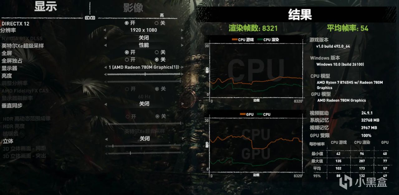 ▲在1080P,预设高画质,XeSS性能模式下,零刻 SER 8可以提供54 FPS的平均帧率,表现也非常好。