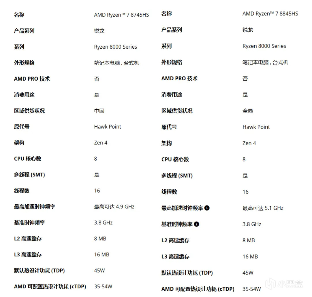 ▲零刻SER 8共有 Ryzen7 8845HS与Ryzen 7 8745HS两款,其参数基本完全一致,8745HS仅在最高加速频率上比8845HS低了200MHz,核显频率上低了100MHz,性能差距不大。