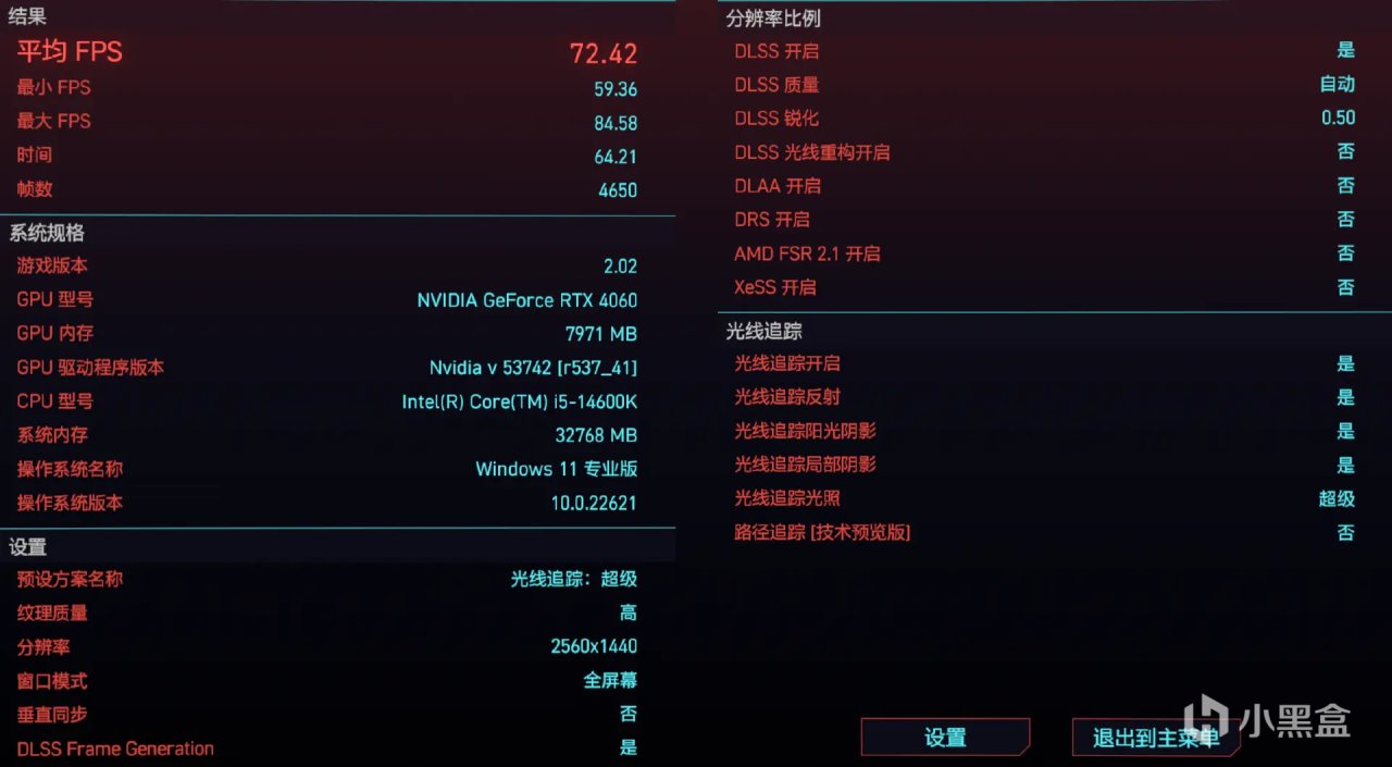 3DMark畢竟也得算是理論測試,那麼實際3A大作的體驗又是什麼樣的呢?我們再拿《賽博朋克 2077》來看一看,這款最早支持光線追蹤,最早支持DLSS 3.5,又一直非常火爆的遊戲則顯得更具有參考價值。