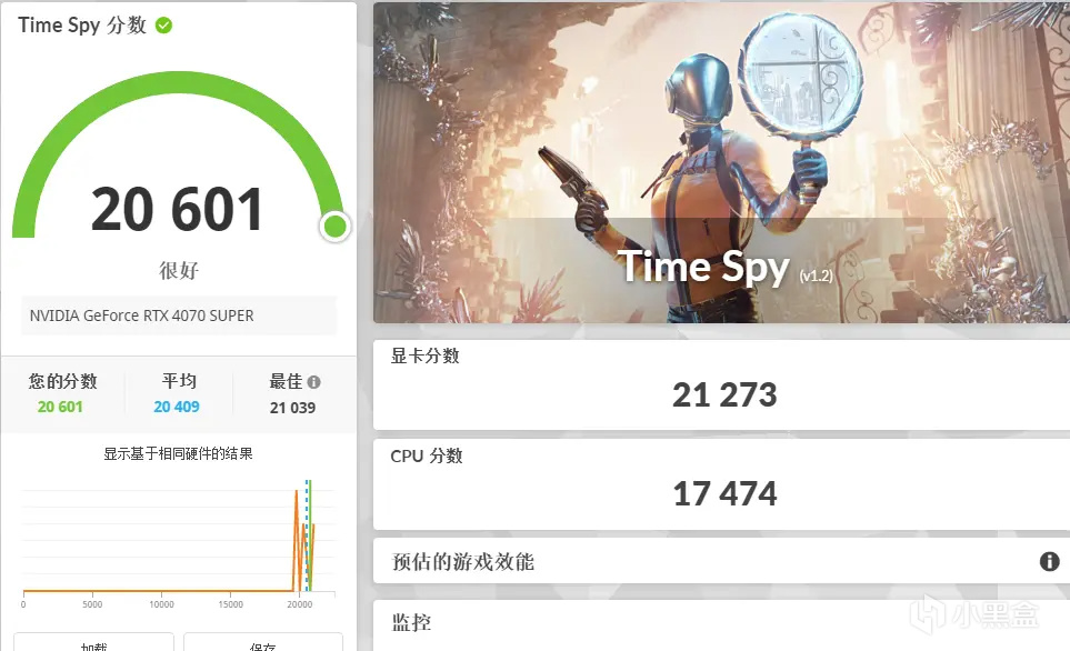 ▲我們簡單來跑一下iGame GeForce RTX 4070 SUPER Ultra W 12GB顯卡的 3D Mark Time Spy性能測試,此電腦Time Spy總得分爲20601分,顯卡分數21273分。