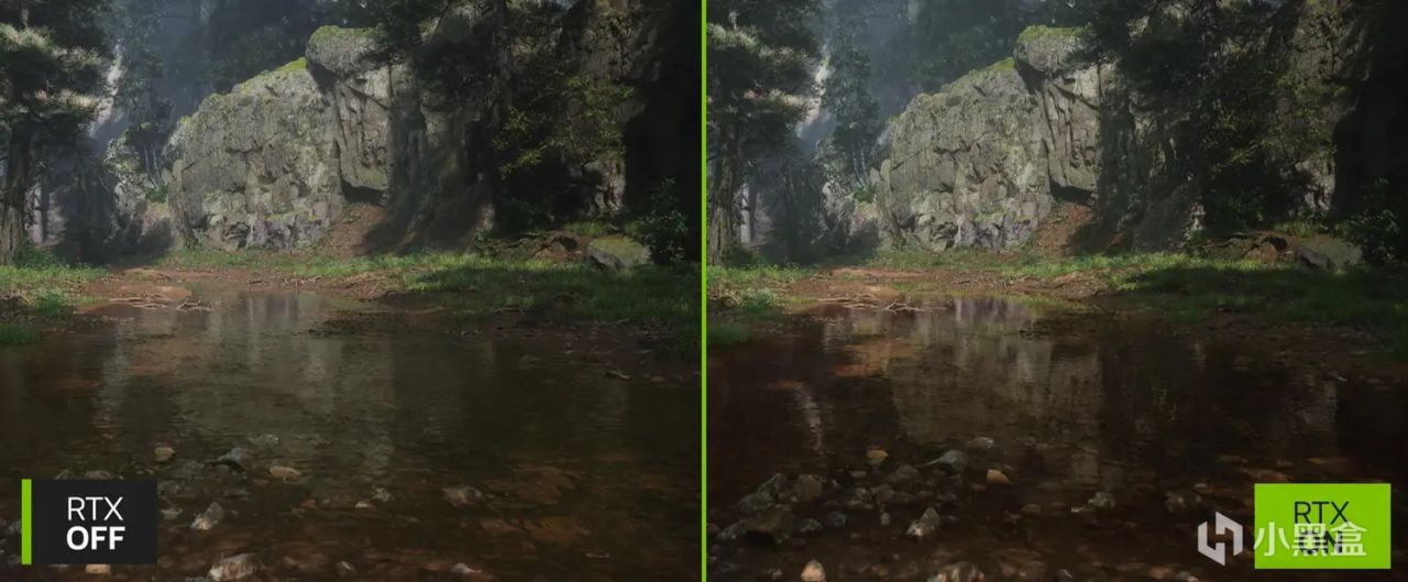 ▲這是《黑神話:悟空》內置Benchmark中的一段場景,關閉光線追蹤技術的左側水面顯得古井無波,而開啓光線追蹤技術的右側水面則波光粼粼,哪個更真實,相信不用我多做解釋了。水面的真實性已經是測試光線追蹤畫面提升的必備項目了,這裏用到的是光線追蹤反射,光線反彈的細節會得到保留,無需多次渲染,也可以讓水面有鏡子般的反射效果。
