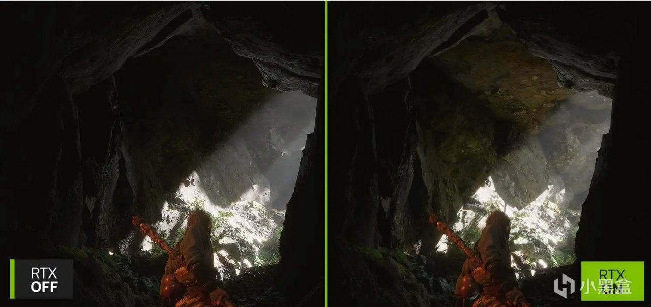 在上面的《黑神話:悟空》的實測場景圖中,我們可以看到關閉光線追蹤時(左側),畫面多處一片死黑,細節丟失嚴重,而在光線追蹤開啓後,漫反射的光使得暗處有了一定的亮度,暗部細節得到了更好的保留,亮暗對比更明顯,畫面也顯得更加真實了。
