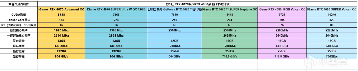 ▲GeForce RTX 40 SUPER系顯卡覆蓋了70級與80級的顯卡,我這裏放上整個GeForce RTX 4070到GeForce RTX 4080 SUPER共6款顯卡的參數圖,方便大家更好的瞭解RTX 4070系與RTX 4080 系顯卡的配置差異,結合後續iGame GeForce RTX 4070 SUPER Ultra W OC 12GB顯卡的測試,可以對其餘幾款顯卡的性能有一個相對準確的理解。