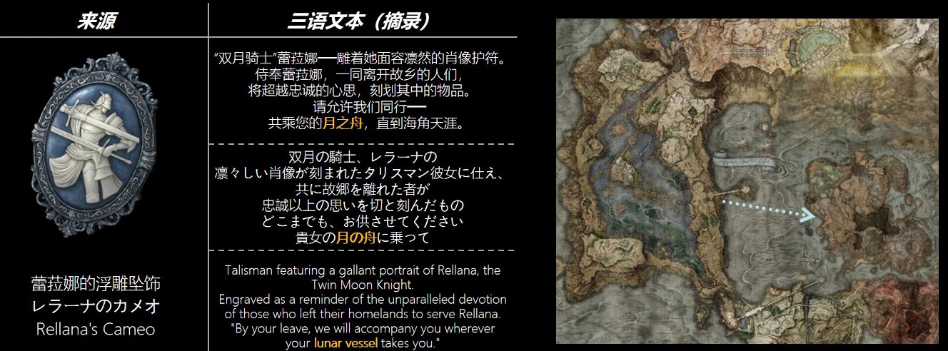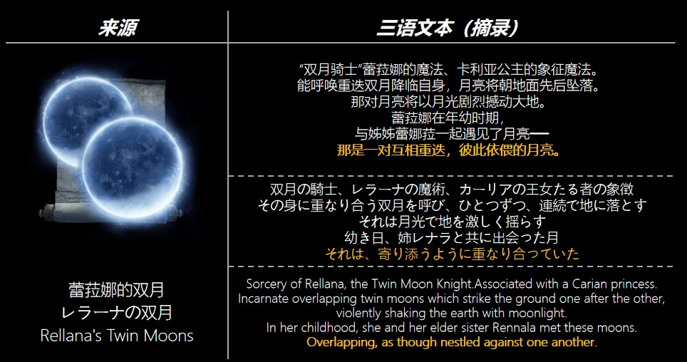 需要注意,蕾菈娜(Rellana)並不是前幾節大顯鋒芒的滿月女王蕾娜菈(Rennala),蕾菈娜是雷娜菈的孿生妹妹。衆所周知,“孿生”的概念在交界地的描述相當曖昧,在對蕾菈娜的信息整理中可以發現,遊戲雖然沒有明確指出卡利亞姐妹倆之間的感情,但總是暗示着他們相伴相生,如影子般聯繫在一起。這種關係就像天空中的兩顆月亮一樣形成了對稱敘事。