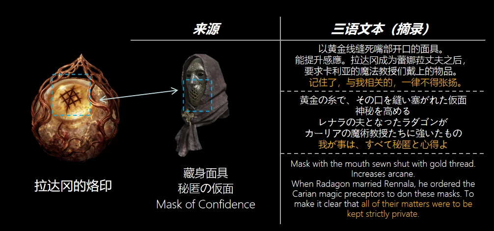 學院魔法教授的面具嘴部都縫有被象徵拉達岡的網狀圖案。雖然信息文本上描述的較爲委婉,但恐怕教授被“封嘴”的程度還是十分高的。