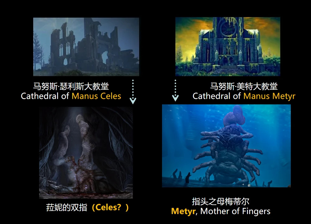 地下藏有指頭生物的這兩座大教堂名字十分值得考究。其中,Manus在拉丁語中有“手”的意思,而Celes則有“星空”之意。而“美特”直指“梅蒂爾”,由此我們或許可以從中得出,菈妮的雙指是否也擁有名字?