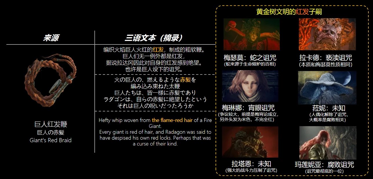不過,巨人似乎和詛咒沒啥聯繫,這裏拉達岡的“自認爲”可能是他的誤解,對此我認爲是這樣的:初始熔爐演化出來的生命以紅色爲底色,無上意志改造的意圖本質想要將生命的底色改造成盧恩之黃,如今的方式便是以黃金樹文明主導的黃金律法。然而作爲律法的象徵,從中誕生的拉達岡即便在成功滅絕巨人一族之後,卻仍然躲不開這一頭紅髮的誕生。這也正是拉達岡所認爲的,來自巨人的詛咒。