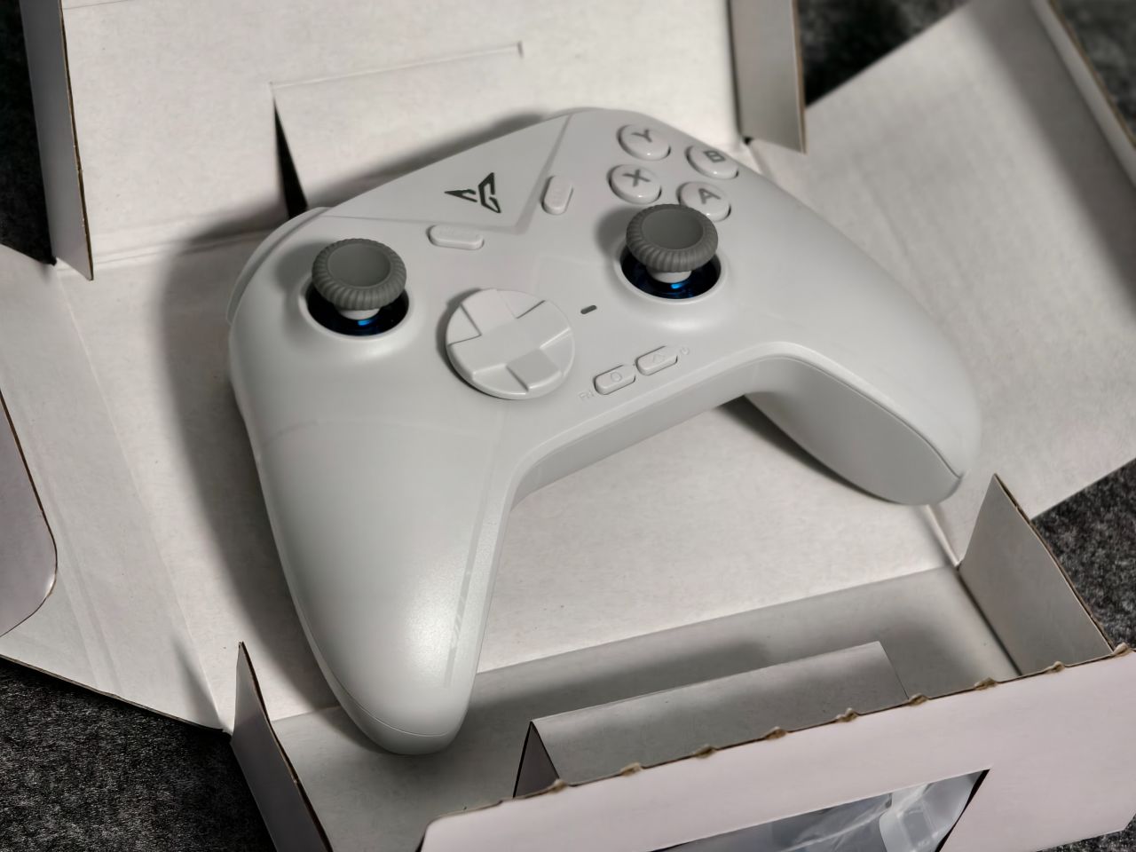 撕开封条便能够看到手柄本体了,本次依旧延续了XSX布局的经典造型。浅灰色的壳体,金属的飞智标志,以及V型的三角,整体是比较简单朴素的设计风格。