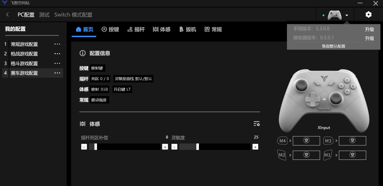 打开飞智官网,下载飞智空间站,连接手柄后便能清楚看到一系列丰富的自定义选项。摇杆调节、键位自定义、体感开关以及死区调节等功能均可自行自定义。