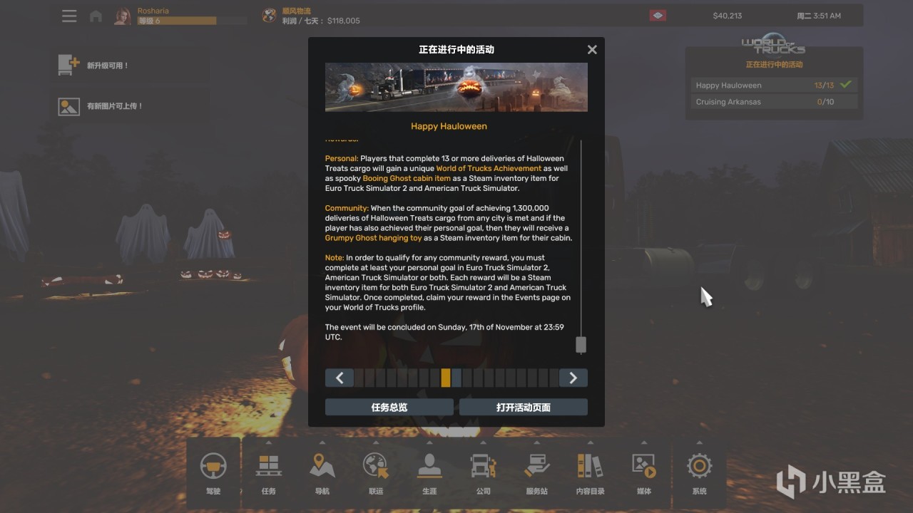 也许是为提高玩家活跃度,游戏官方时不时会推出一些活动任务供玩家们一同完成。例如近期的万圣节专题活动。玩家可以通过任务接取界面的“外部任务”栏找到,完成13趟关于万圣节糖果货箱的运送,即可完成个人活动任务,难度方面也不算高,基本1-2天即可完成。当玩家完成活动任务,后续会收到得活动对应的专属车内饰品。