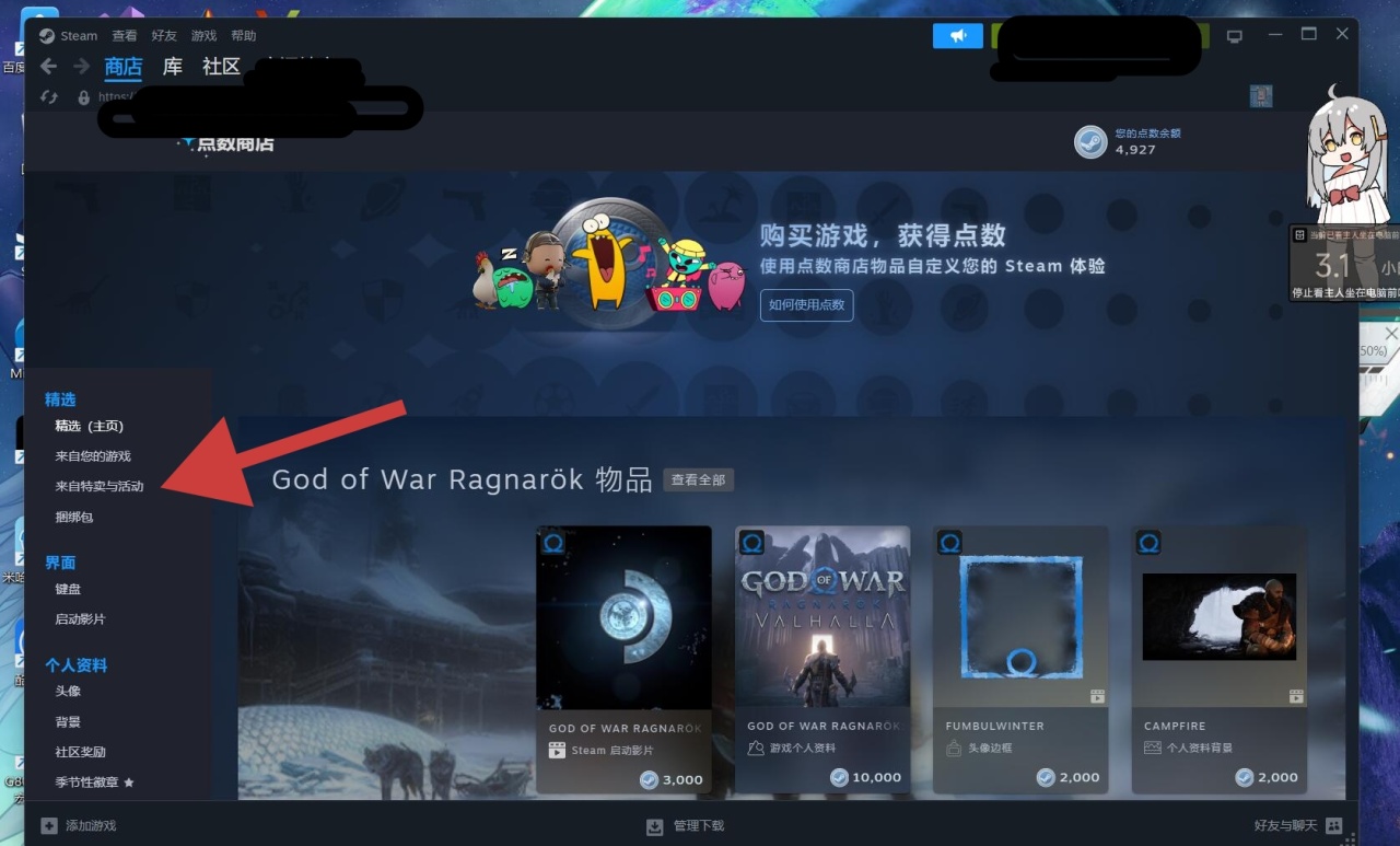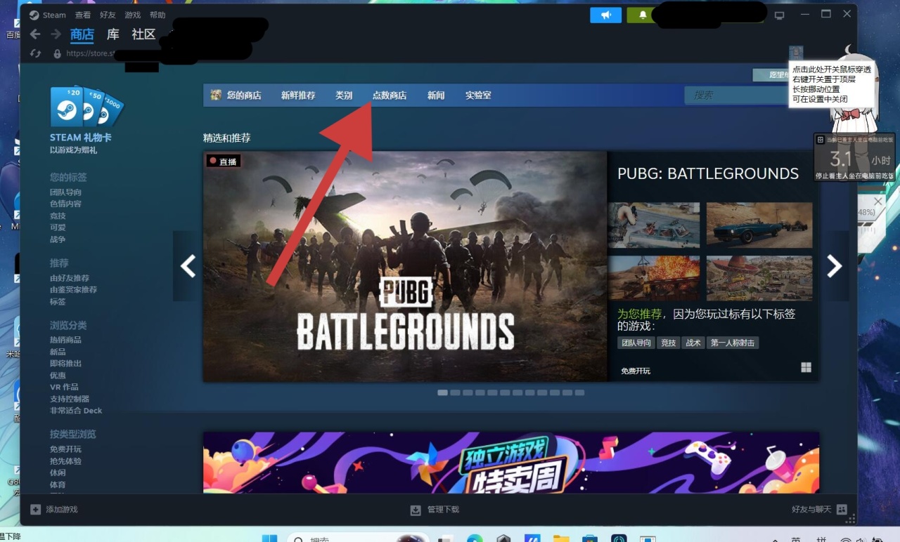 1.先打開加速器,再打開steam(網頁端搜:s。team),如下圖,然後點擊紅色箭頭所指位置“點卷商店”。