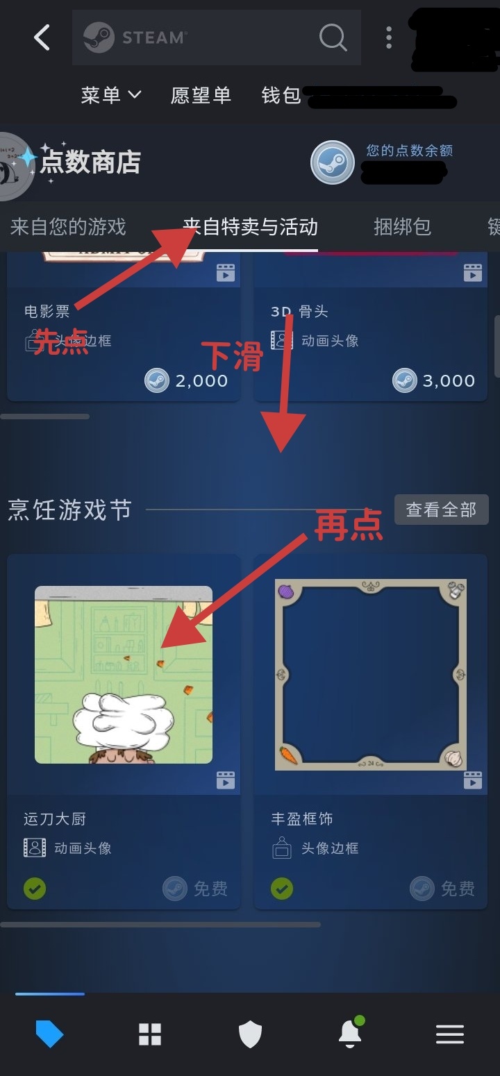 3.進入點卷商店之後,如下圖所示,先點“來自特賣與活動”(沒找到可以左右滑一下),然後下滑,找到“烹飪遊戲節”,再點擊標有免費的點卷商品即可領取。