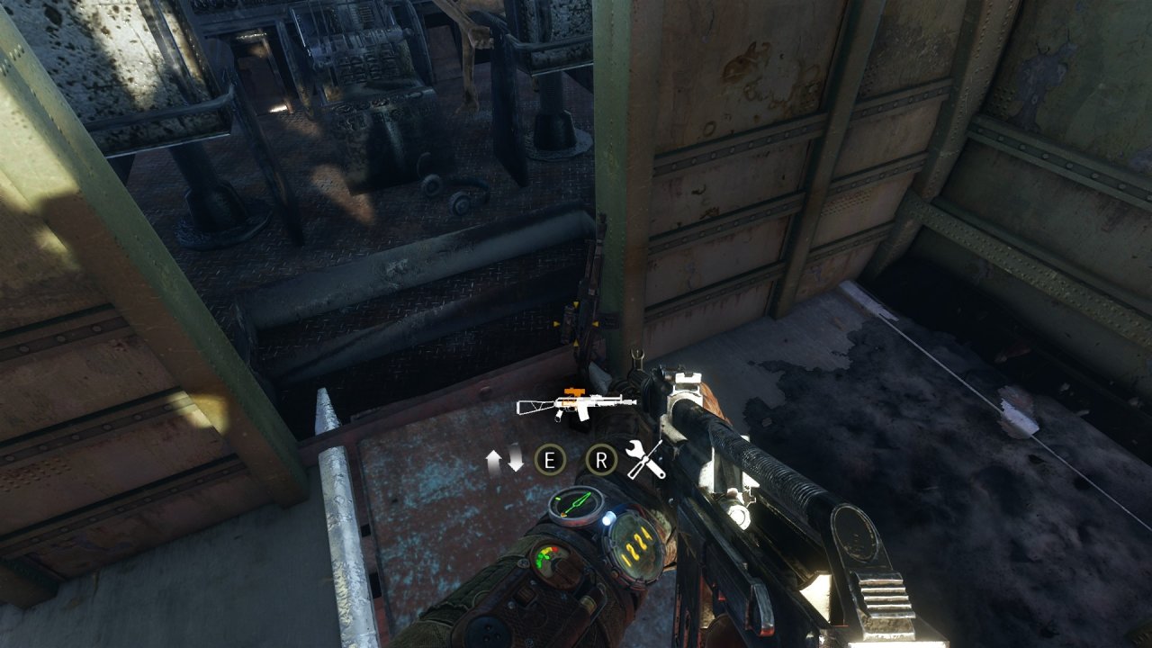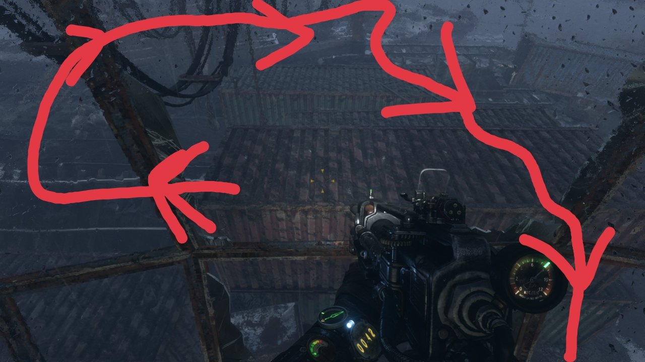 從實驗室出去後,會聽到有人在倉庫喊我們,先不要去倉庫,直接走右後方,一路走上集裝箱然後跳上塔吊進入塔吊室拿走武器槍配件,然後再去倉庫!
