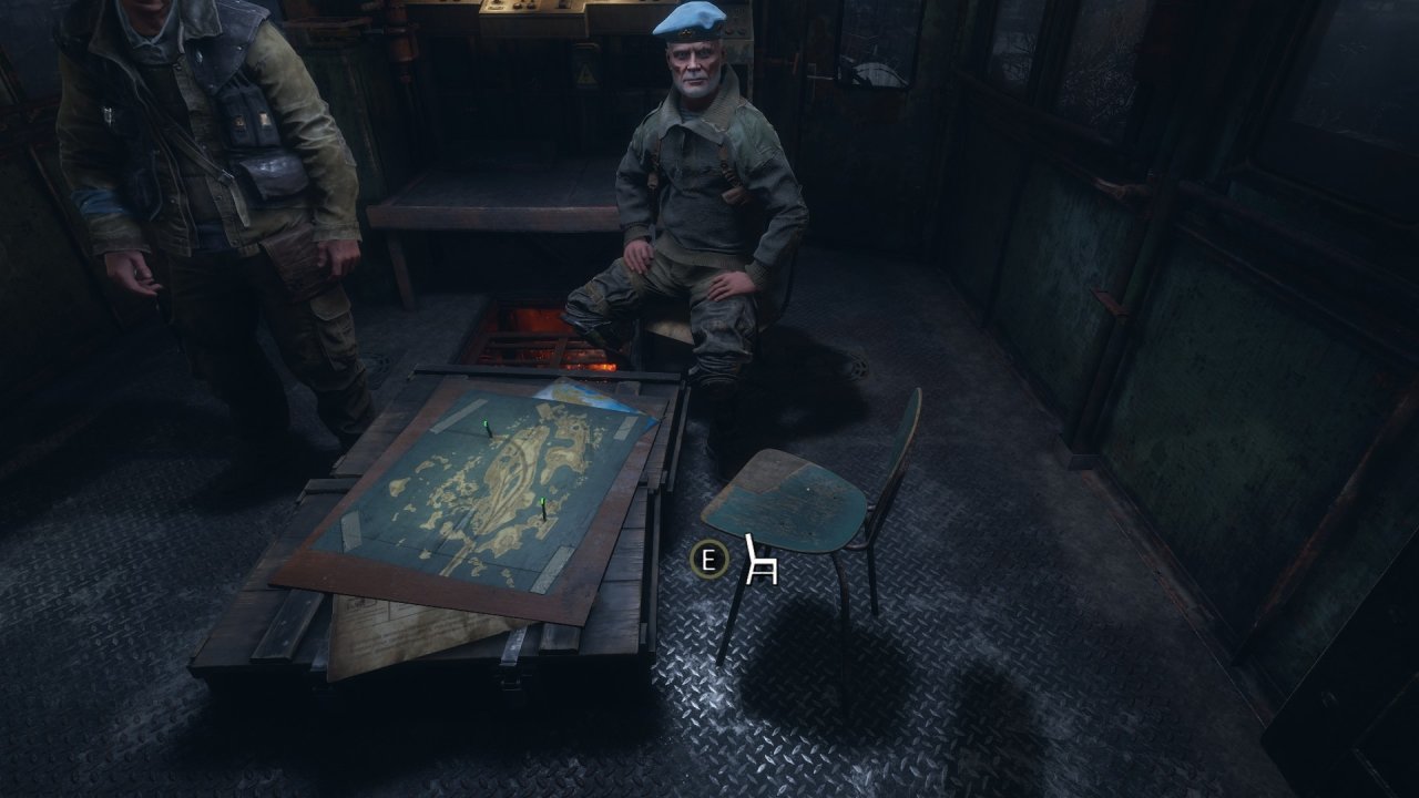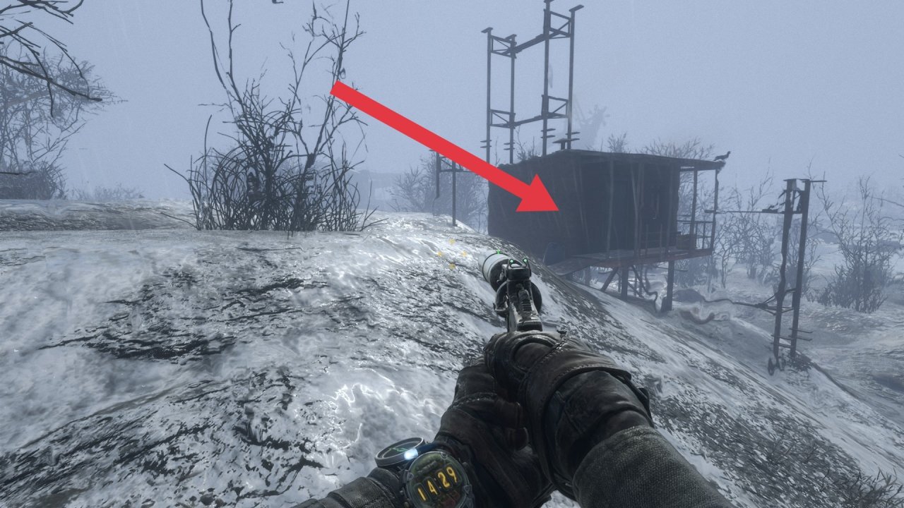 按“M”看地圖,在前往下一個主線地點處時,我們會經過一個地堡上方(後期會進地堡),旁邊有一個小屋,裏面有工作臺和槍配件!