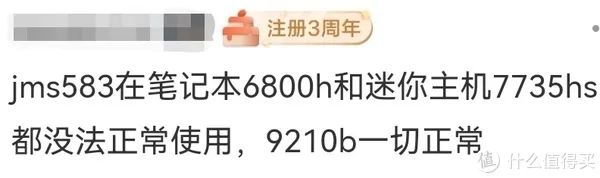JMS583則同部分硬件平臺兼容性不佳。不少ZEN3+平臺處理器的用戶反饋,JMS583在他們的準系統、筆記本上會遭遇掉盤。