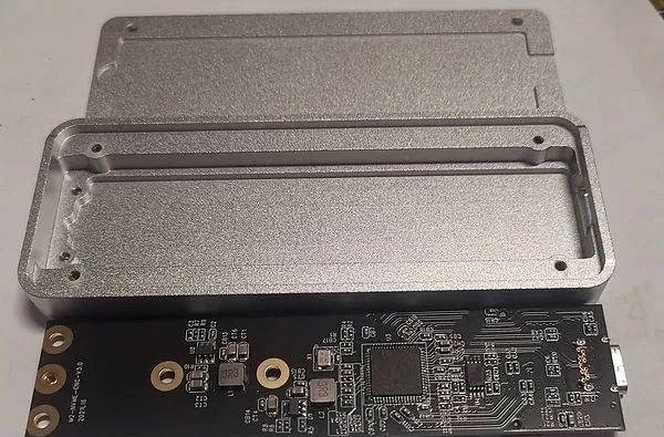 這款硬盤盒的亮點在於散熱設計,它使用了少見的後開蓋方案,上方與側面爲一個整體,PCB倒置安裝在硬盤盒內。