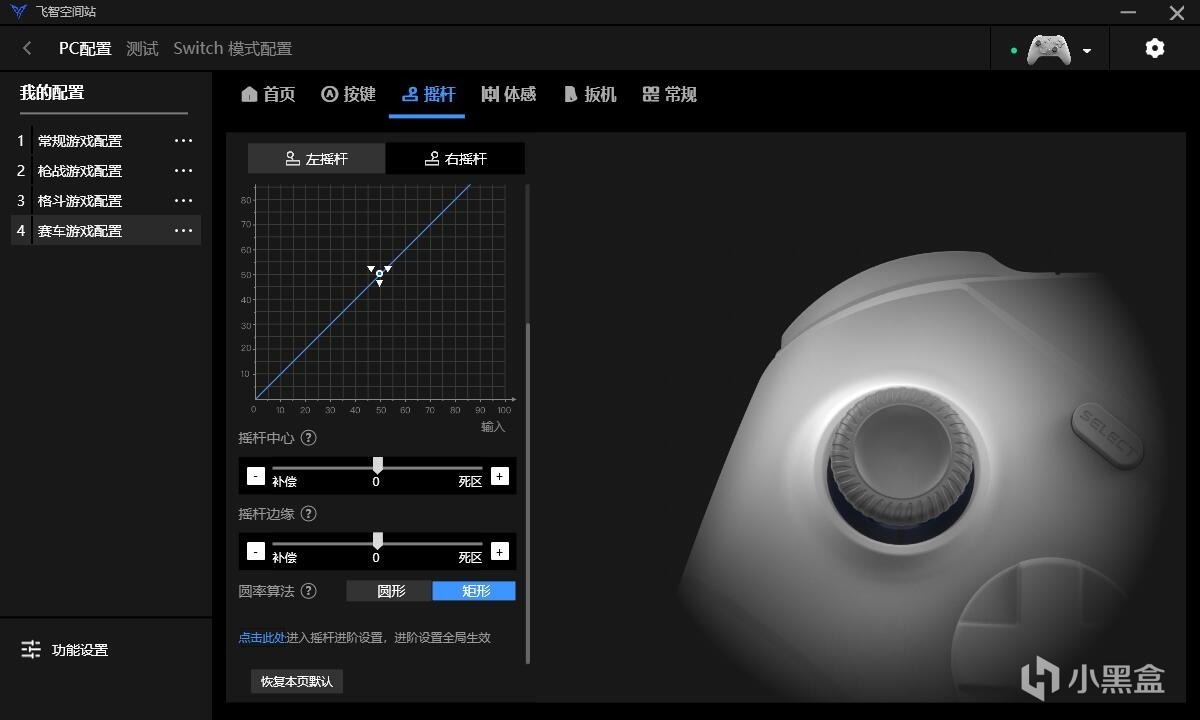 摇杆调教方面则可以在驱动中进行调节有无死区,调节圆形矩形的调教切换,也是很人性化的。