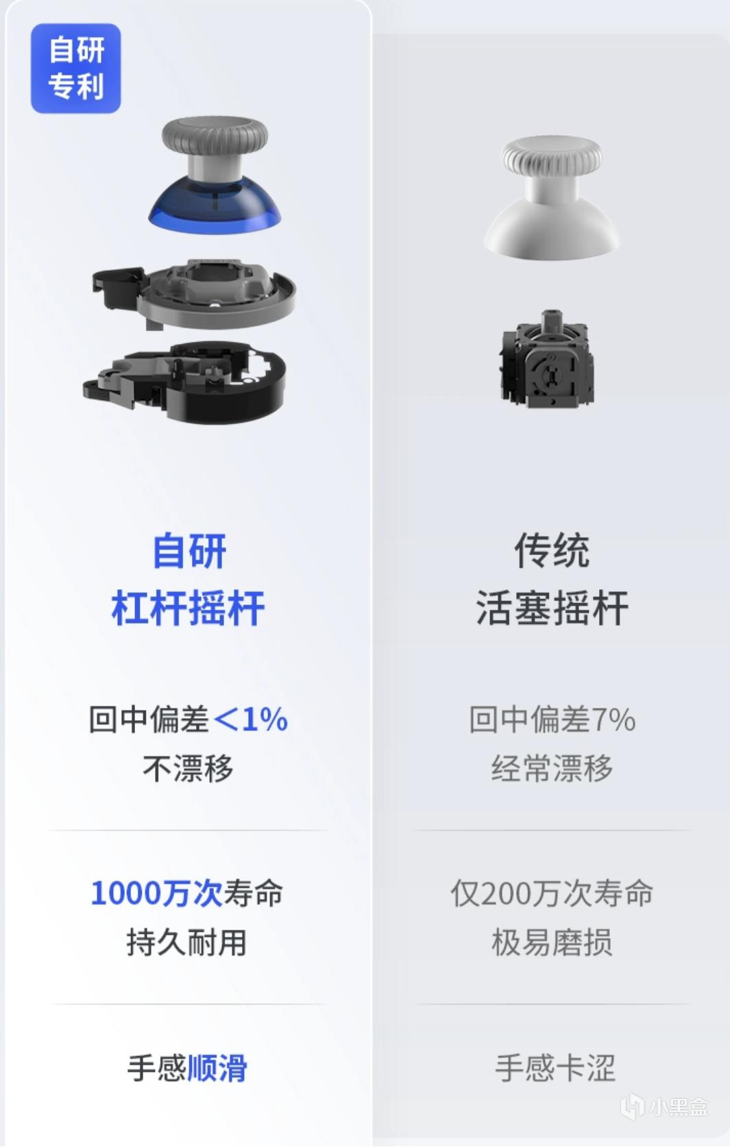 最后就是这次冰原狼3升级的重点了,也就是目前飞智家旗舰同款的自研杠杆摇杆,原本在八爪鱼4应用的摇杆,如今随着飞智技术的下放直接让百元手柄也能用上,可以说是相当良心了。这也是本次取消POM环设计的原因,自研杠杆摇杆相较于传统的活塞摇杆,拥有超强回中不漂移,手感顺滑,寿命更久的特点,虽然相较于黑武士4无法调节摇杆的阻尼,但整体受力均匀手感顺滑,精细度更高,对于游戏的体验提升很大。