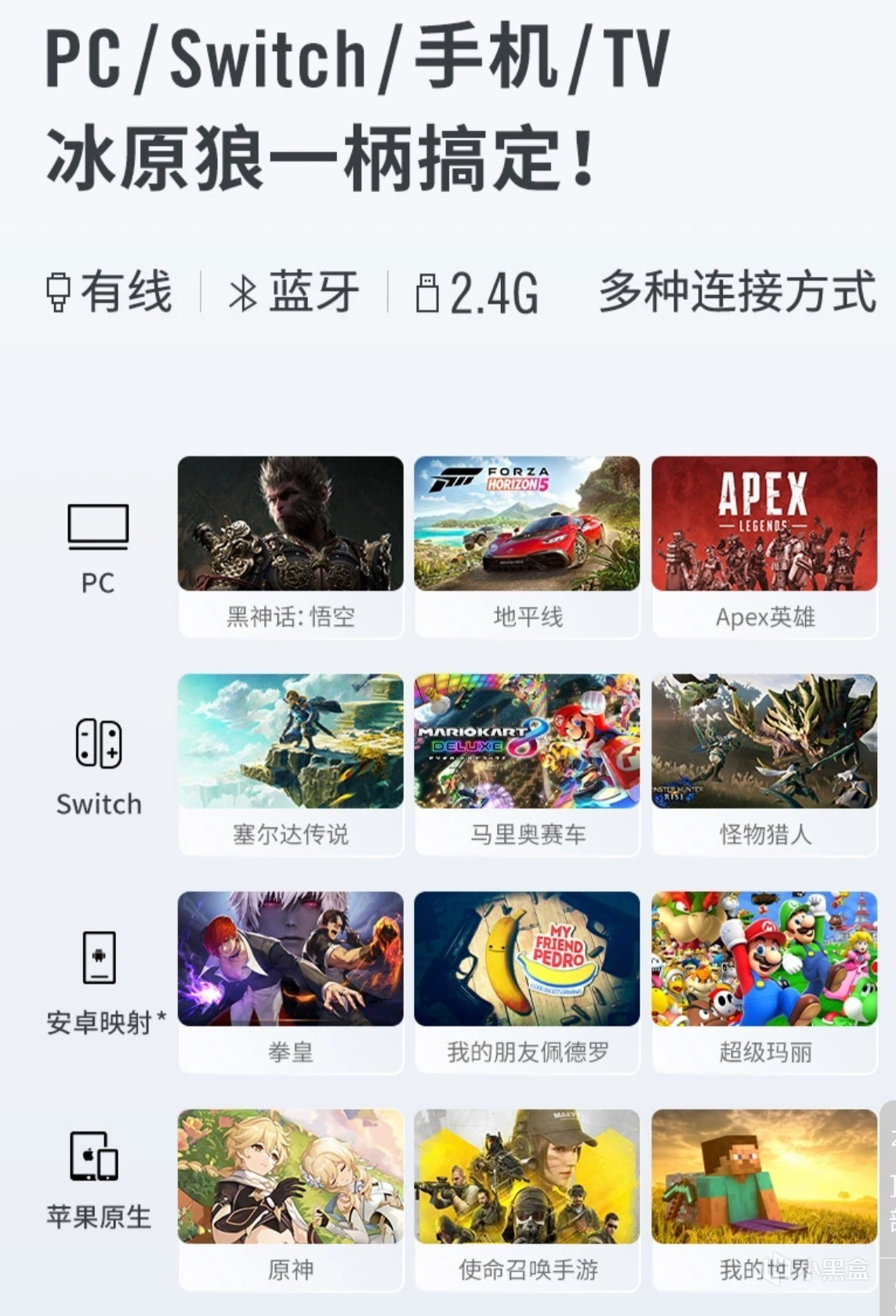 其他方面,在其他方面飞智冰原狼3配备了800mah电池,搭载六轴陀螺仪,支持体感映射,并且支持三模多平台连接,有趣的是这次还在安卓机上支持安卓映射,一些无法使用手柄游玩的游戏也可以通过映射来游玩了。