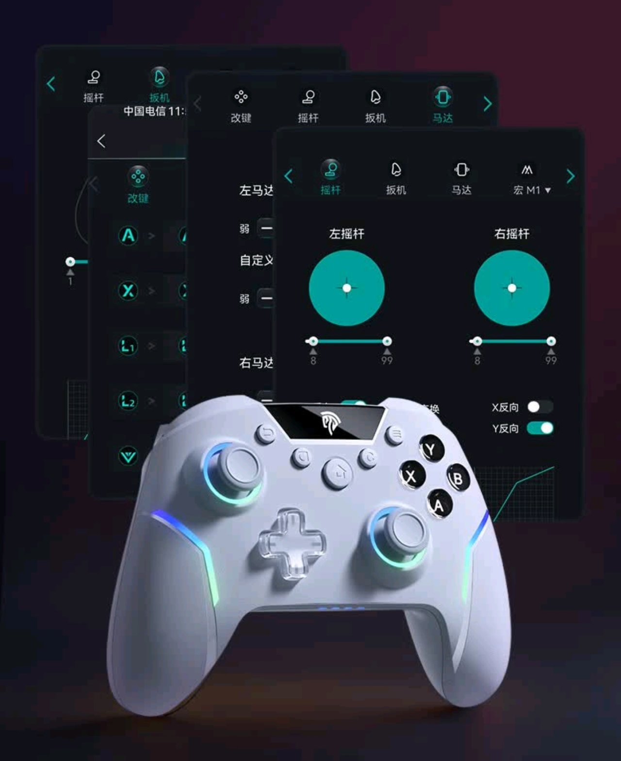 手柄使用了XSX同款非对称线性马达,震感细腻,还支持六轴的体感陀螺仪,除了原生NS下使用外,还支持映射摇杆在PC与其他设备使用体感功能。