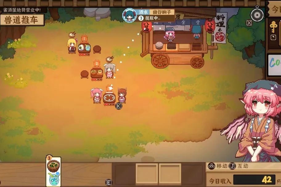 你扮演移动烧烤屋的老板娘米斯蒂娅,白天去幻想乡的各处收集食材,研究可口的料理;收集或购买酒水,给客人们增加就餐的体验。总而言之,这里没有战斗,没有弹幕,只有客人,和为了满足客人的高情商厨娘米斯蒂娅!