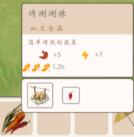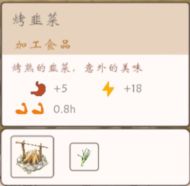 遊戲中基本所有的食材都是可以烤的,於是在我拷完韭菜後,我發現它可以加一些地瓜沒有的特殊屬性,這應該是力量提升了,這也告訴了我們,多喫點韭菜對身體好(?