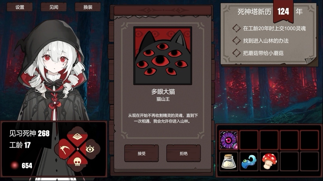 你將扮演一位見習期死神,收割靈魂償還債務。隨機的抉擇事件爲你提供多種選擇:反正靈魂還不完,躺在牀上擺擺爛。跟着前輩賺外快,收集衣服換着穿。見習期死神的命不是命,重來的次數無窮盡。
